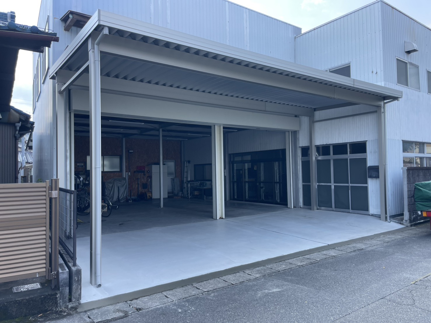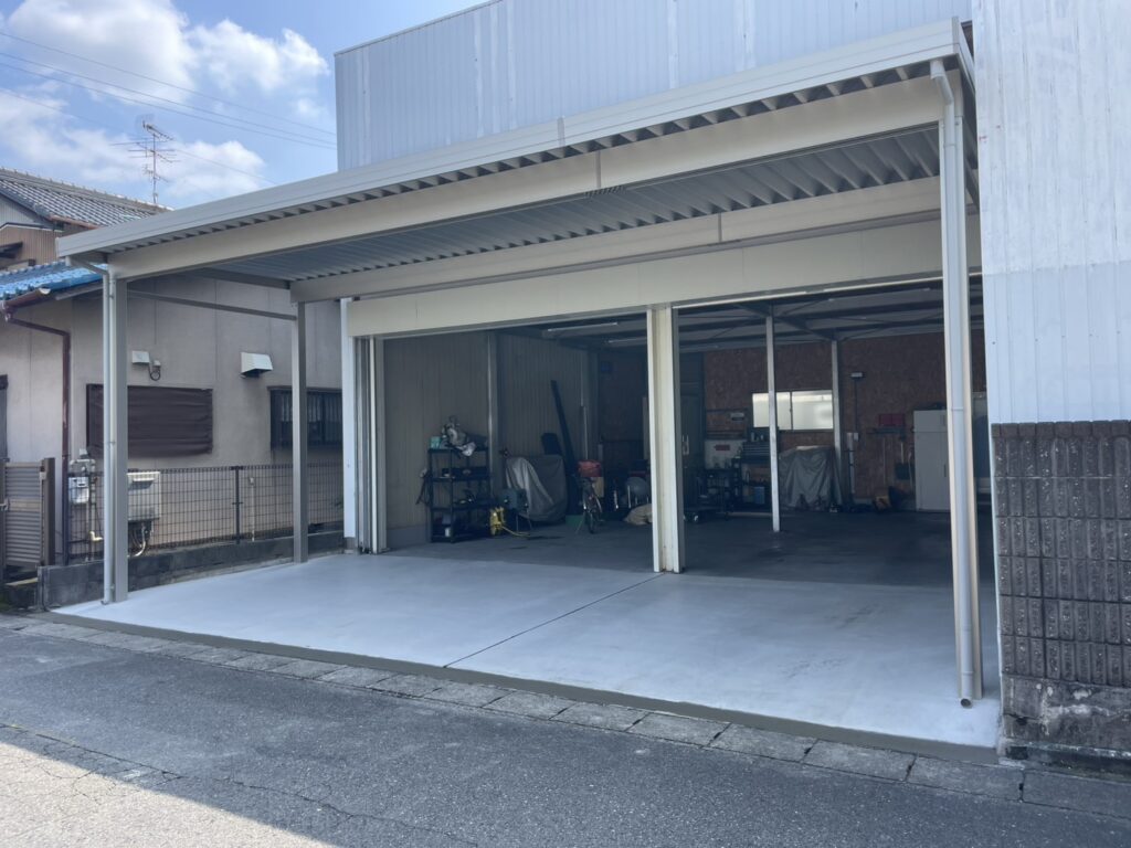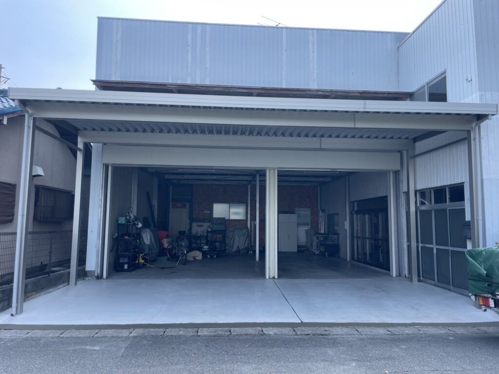元々建っていた看板の骨組みを解体、その後既設土間と敷きレンガを解体し、折板カーポートを新設😌土間も新しくさせていただきました😊